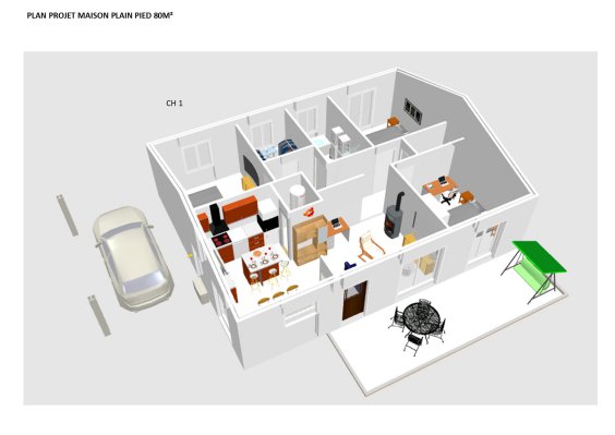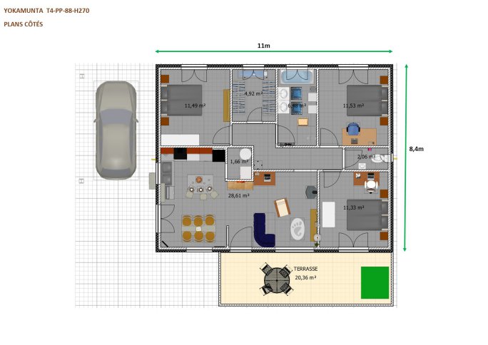 Modèle YOKAMUNTA T4-PP-88-H270 Ce modèle de plan de maison individuelle plain pied est conçu de façon à vous proposer des espaces à vivre d'une superficie confortable.